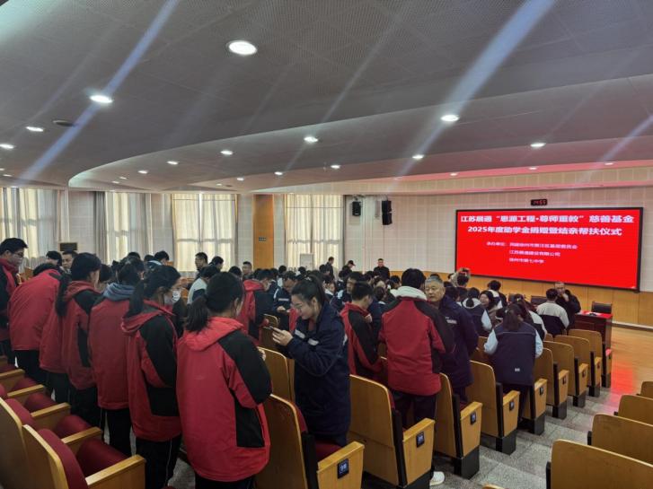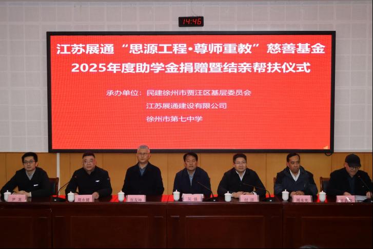11月19日下午,江蘇展通“思源工程·尊師重教”慈善基金2025年度捐贈暨結親幫扶儀式在徐州市第七中學報告廳舉行。本次活動由民建徐州市賈汪區基層委員會、會員企業江蘇展通建設有限公司與徐州市第七中學聯合舉辦。民建徐州市賈汪區基層委主委、賈汪區住房和城鄉建設局局長付洋,賈汪區基層委副主委、江蘇展通建設有限公司董事長張友坤,徐州市第七中學校長吳強參加活動,徐州市第七中學工會主席王武和主持活動。